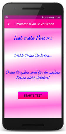 Beschreibung:Mit "Paartest" kann ein Paar seine sexuellen Vorlieben vergleichen.Kreuzen Sie ihre geheimen Wünsche u. Vorliebenan, welche Sie ihrem Partner nicht sagen würden.Die eingegebenen Daten der zwei Testpersonen bleiben bis zur Auswertung geheim. In der Auswertung werden dann nur die Themen angezeigt, welche beide Personen ausgewählt hatten. Die Auswertung kann gespeichert werden.Außerdem kann die App mit einem Passwortgeschützt werden.Lassen Sie sich überraschen!Android - Versionen:Ab Android 4.4.2 (Kitkat)Optimiert für Handy´sBerechtigungen:Internet (Hilfe Anzeige zu einem ausgewähltenThema).Bilder:Die Bilder der App entstanden mit Android 7.Die App kann auf älteren Versionen anders aussehen!