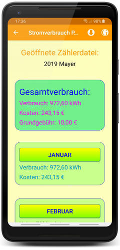 Stromverbrauch:- Intuitive Bedienung u. Online Hilfe in der App- Monatliche Anzeige der Stromkosten u. verbrauchten kWh.- Gesamtanzeige der Stromkosten u. kWh über das Jahr.- Detailansicht für jedes Monat.- Tendenz Stromverbrauch "Plus - Minus" zum Vormonat.- Grafische Anzeige.- Es kann eine unbegrenzte Anzahl von Stromzählern verwendet werden.- Es können zwei Zählerdateien verglichen werden (z.B. Zählerdateien Stromverbrauch 2020 u. 2021).- Es können mehrere Stromzähler addiert werden.- Kalender Eintrag erstellen (Zähler ablesen).- PDF - Dateien aus Zählerdateien Erstellen. Für z.B. Drucken oder Archivieren am PC.- Eigene Datensicherung über die AppPLUS:- Elektrogerätekauf Verbrauchsvergleichs Rechner (Kosten: Monat, Jahr).- Verbrauch Einzelgerät ermitteln (Kosten: Monat, Jahr, Tag).- Einfacher Preisvergleich mit anderen Stromanbieter.- Belastbarkeit (Watt) von Sicherungen anzeigen.- Farbtabelle Sicherungen- Geräteliste anlegen