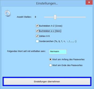 Generieren Sie Passwörter aus Großbuchstaben, Kleinbuchstaben, Zahlen u. Sonderzeichen.Fügen Sie ein vorgegebenes Wort in das zu generierende Passwort mit ein.Testen Sie sofort die richtige Eingabe Ihres generierten Passwortes.Speichern Sie das Passwort in einer Textdatei ab.Keine Installation nötig ( Standalone ).