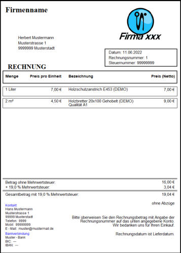 - Mit RechnungFixxx können Sie Rechnungen Erstellen u. Verwalten.- Rechnungen schreiben (Beginn der Rechnungsnummer einstellbar)- Mahnungen schreiben- Rechnungen Verwalten (Speichern, aus gespeicherten Rechnungen Mahnungen erstellen…)- Integrierte, automatische Datensicherung (Alle Rechnungen u. Programmeinstellungen)- Eigenes Logo in Rechnung integrieren- Notizfunktion- Verschiedene Rechnungslayouts, anpassbar- Rechnungen schreiben mit selbst erstellten Produktlisten (Fünf Produktlisten)- Kundendatenbank für Kundenadressen- Integrierte Hilfedatei zum Programm