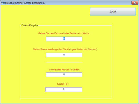 Programm zum Erfassen Ihres jährlichen Stromverbrauches. Berechnung des Verbrauchs einzelner elektrischer Geräte. Grafische Anzeige. Druckausgabe.Neu: Verbraucherliste. Fügen Sie alle Ihre Geräte in eine Liste ein. Es werden die monatlichen u.jährlichen Kosten, sowie der monatliche u. jährliche Verbrauch automatisch berechnet.Vergleichen Sie zwei Geräte, z.B. zwei Fernseher mit verschiedenen Verbrauch.Keine Installation nötig ( Standalone ).