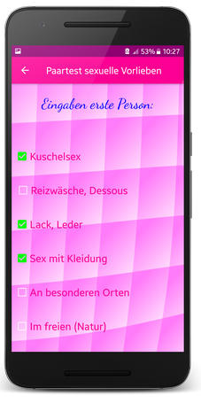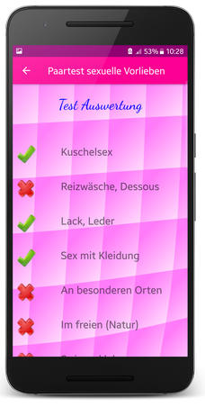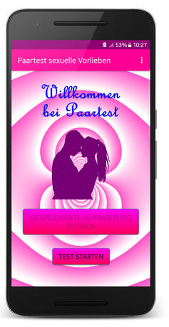 Beschreibung:Mit "Paartest" kann ein Paar seine sexuellen Vorlieben vergleichen.Kreuzen Sie ihre geheimen Wünsche u. Vorliebenan, welche Sie ihrem Partner nicht sagen würden.Die eingegebenen Daten der zwei Testpersonen bleiben bis zur Auswertung geheim. In der Auswertung werden dann nur die Themen angezeigt, welche beide Personen ausgewählt hatten. Die Auswertung kann gespeichert werden.Außerdem kann die App mit einem Passwortgeschützt werden.Lassen Sie sich überraschen!Android - Versionen:Ab Android 4.4.2 (Kitkat)Optimiert für Handy´sBerechtigungen:Internet (Hilfe Anzeige zu einem ausgewähltenThema).Bilder:Die Bilder der App entstanden mit Android 7.Die App kann auf älteren Versionen anders aussehen!