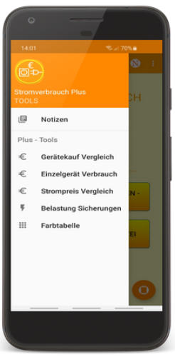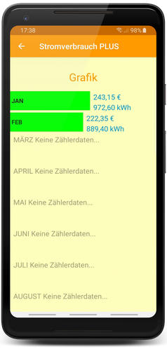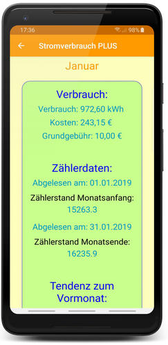 Stromverbrauch:- Intuitive Bedienung u. Online Hilfe in der App- Monatliche Anzeige der Stromkosten u. verbrauchten kWh.- Gesamtanzeige der Stromkosten u. kWh über das Jahr.- Detailansicht für jedes Monat.- Tendenz Stromverbrauch "Plus - Minus" zum Vormonat.- Grafische Anzeige.- Es kann eine unbegrenzte Anzahl von Stromzählern verwendet werden.- Es können zwei Zählerdateien verglichen werden (z.B. Zählerdateien Stromverbrauch 2020 u. 2021).- Es können mehrere Stromzähler addiert werden.- Kalender Eintrag erstellen (Zähler ablesen).- PDF - Dateien aus Zählerdateien Erstellen. Für z.B. Drucken oder Archivieren am PC.- Eigene Datensicherung über die AppPLUS:- Elektrogerätekauf Verbrauchsvergleichs Rechner (Kosten: Monat, Jahr).- Verbrauch Einzelgerät ermitteln (Kosten: Monat, Jahr, Tag).- Einfacher Preisvergleich mit anderen Stromanbieter.- Belastbarkeit (Watt) von Sicherungen anzeigen.- Farbtabelle Sicherungen- Geräteliste anlegen