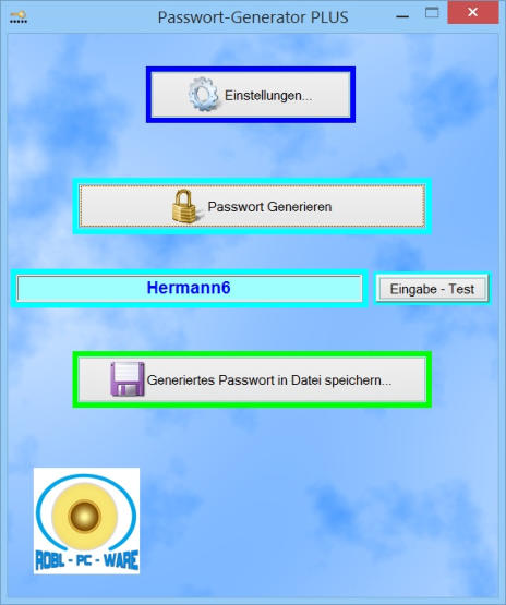 Generieren Sie Passwörter aus Großbuchstaben, Kleinbuchstaben, Zahlen u. Sonderzeichen.Fügen Sie ein vorgegebenes Wort in das zu generierende Passwort mit ein.Testen Sie sofort die richtige Eingabe Ihres generierten Passwortes.Speichern Sie das Passwort in einer Textdatei ab.Keine Installation nötig ( Standalone ).