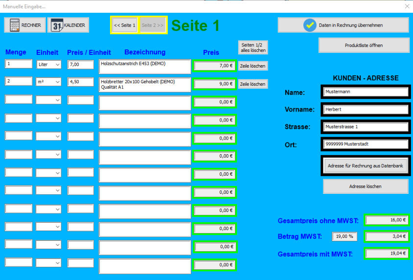 - Mit RechnungFixxx können Sie Rechnungen Erstellen u. Verwalten.- Rechnungen schreiben (Beginn der Rechnungsnummer einstellbar)- Mahnungen schreiben- Rechnungen Verwalten (Speichern, aus gespeicherten Rechnungen Mahnungen erstellen…)- Integrierte, automatische Datensicherung (Alle Rechnungen u. Programmeinstellungen)- Eigenes Logo in Rechnung integrieren- Notizfunktion- Verschiedene Rechnungslayouts, anpassbar- Rechnungen schreiben mit selbst erstellten Produktlisten (Fünf Produktlisten)- Kundendatenbank für Kundenadressen- Integrierte Hilfedatei zum Programm