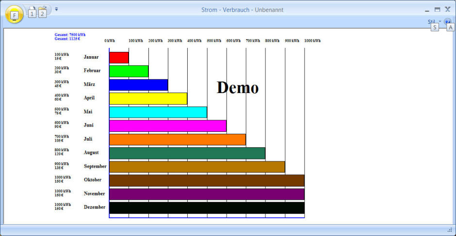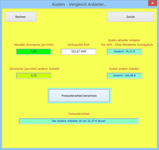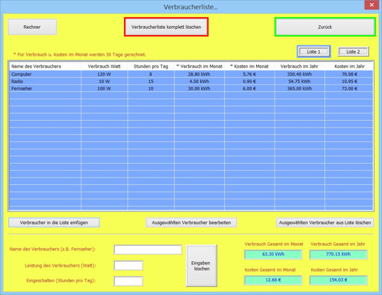 Programm zum Erfassen Ihres jährlichen Stromverbrauches. Berechnung des Verbrauchs einzelner elektrischer Geräte. Grafische Anzeige. Druckausgabe.Neu: Verbraucherliste. Fügen Sie alle Ihre Geräte in eine Liste ein. Es werden die monatlichen u.jährlichen Kosten, sowie der monatliche u. jährliche Verbrauch automatisch berechnet.Vergleichen Sie zwei Geräte, z.B. zwei Fernseher mit verschiedenen Verbrauch.Keine Installation nötig ( Standalone ).