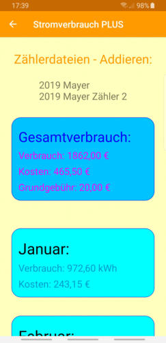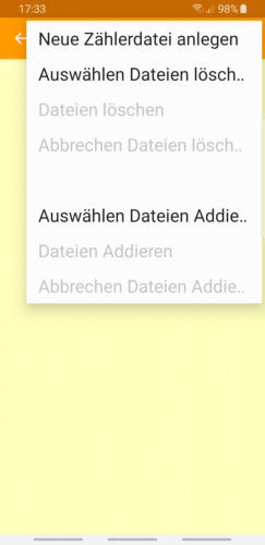 Linkes Bild: Klicken Sie auf das Menü - Symbol.Zweites Bild von Links: Tippen Sie auf “Auswählen Dateien Addieren”.Drittes Bild von Links: Tippen Sie auf die Dateien, welche Sie addieren wollen.Zweites Bild von Links: Tippen Sie auf “Dateien Addieren”.Es können bis zu Zehn Dateien addiert werden.Die Anzeige mit den addierten Dateien wird geöffnet (Bild unten).Oben sehen Sie die Dateien die addiert wurden.